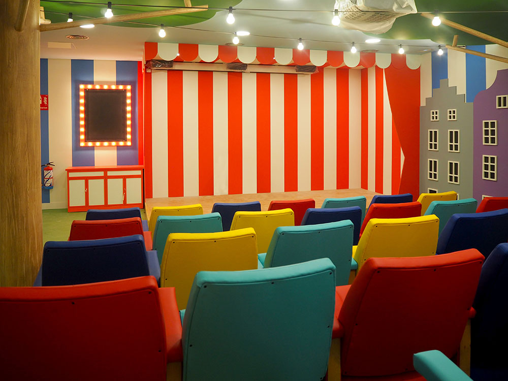 Cuando los pequeños visitan el cine encuentran un sitio que nada tiene que ver con su día a día en el hospital. Está todo decorado como un mini mundo imaginario con animales tocando instrumentos y edificios de colores que simulan una ciudad de tamaño reducido para jugar y soñar. A los dos lados del espacio de butacas, que está escalonado, hay estructuras de madera que son los troncos de unos árboles con ramas cuyas copas llegan al techo y están iluminadas. Ha sido diseñado por el estudio Cousi Interiorismo y la intervención ha sido posible gracias a la colaboración de la familia Campos Fernández-Valdés y financiada por las empresas Microsoft, Entradium, Bankia, Pintaderas, Ecovidrio y el Club Internacional de la Amistad.