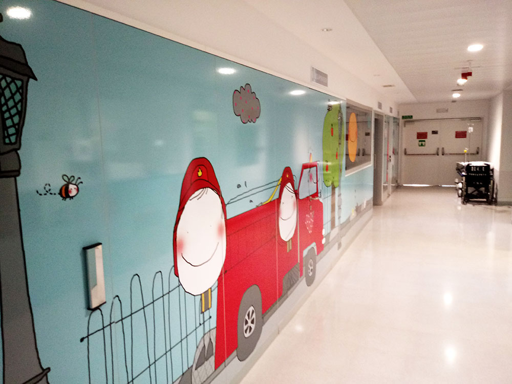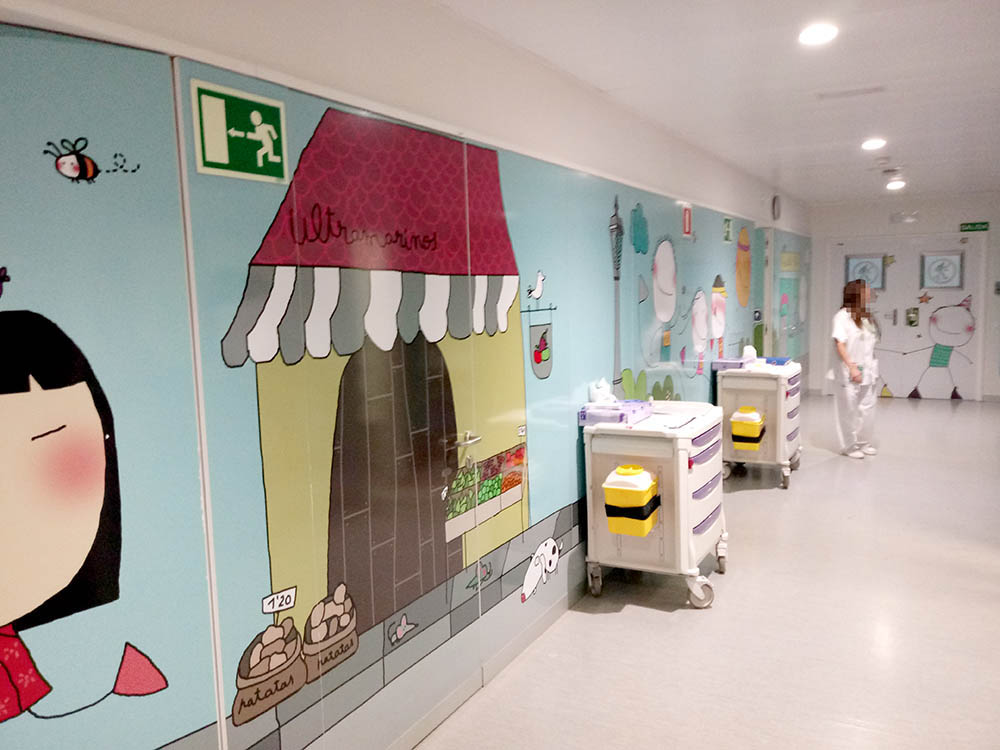 Además del cine, y dentro de la política de humanización de los espacios físicos, se han realizado diferentes intervenciones como la decoración mural de los pasillos, sala de juegos, escuela, urgencias pediátricas.