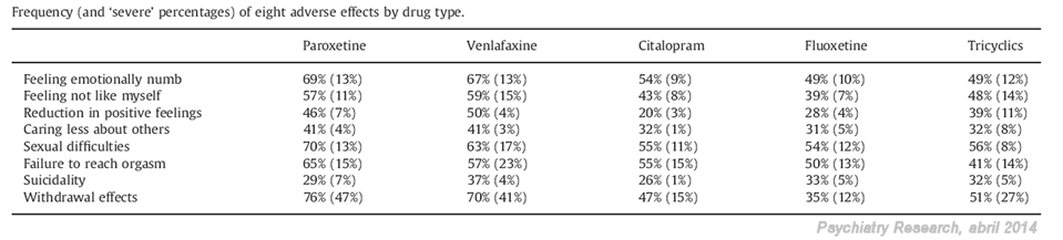 que analiza los efectos adversos emocionales e interpersonales comunicados por adultos con tratamiento antidepresivo, en Nueva Zelanda. El estudio fue realizado mediante un cuestionario completado por 1.829 adultos que habían recibido antidepresivos en los últimos cinco años. De los 20 efectos adversos estudiados, 8 se dieron en más de la mitad de los pacientes. Los de mayor frecuencia fueron las dificultades sexuales (62%) y sentirse emocionalmente indiferente (60%). Otros efectos adversos fueron: sentirse "no como yo mismo" (52%), reducción en sentimientos positivos (42%), preocuparse menos acerca de otros (39%), ideas de suicidio (39%) y efectos de retirada (55%). De todos los antidepresivos analizados en este trabajo, paroxetina y venlafaxina mostraron una mayor frecuencia de efectos adversos, mayor incluso que los tricíclicos (ver tabla de resultados).
