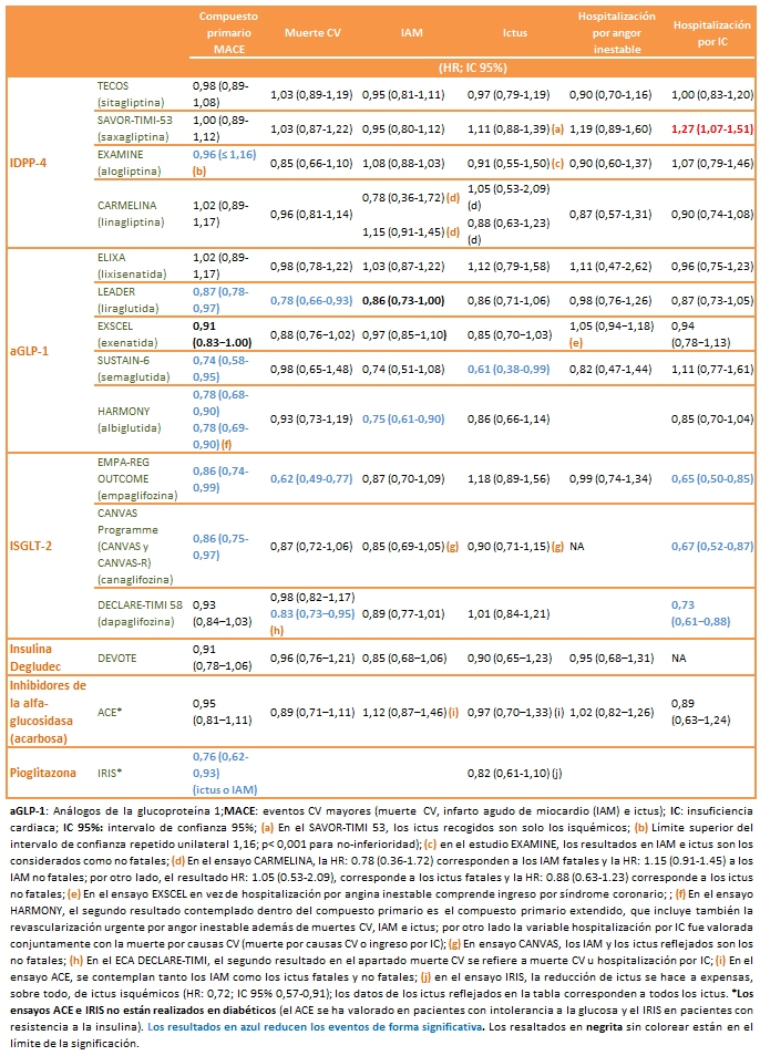 , en el que se concluía lo siguiente: "Los ensayos realizados hasta el momento han mostrado que no existe un incremento en el riesgo CV e incluso, en algunos casos, tales como empaglifozina, semaglutida o liraglutida, los resultados podrían sugerir cierta protección cardiovascular. No obstante, sería necesario confirmar este posible efecto con ensayos diseñados con este objetivo".