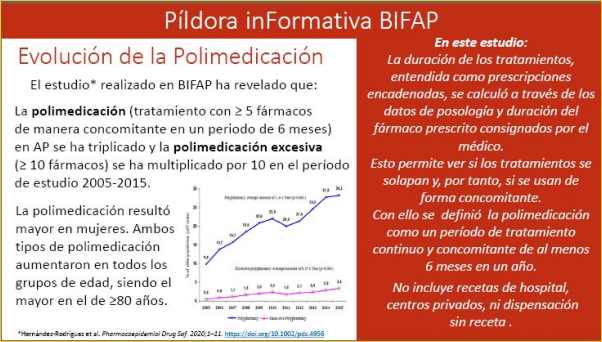 ha publicado una nueva Píldora inFormativa que aborda el problema creciente de la polimedicación, en la que se recoge parte de los resultados de un estudio de autores españoles, publicado en Pharmacoepidemiology & Drug Safety