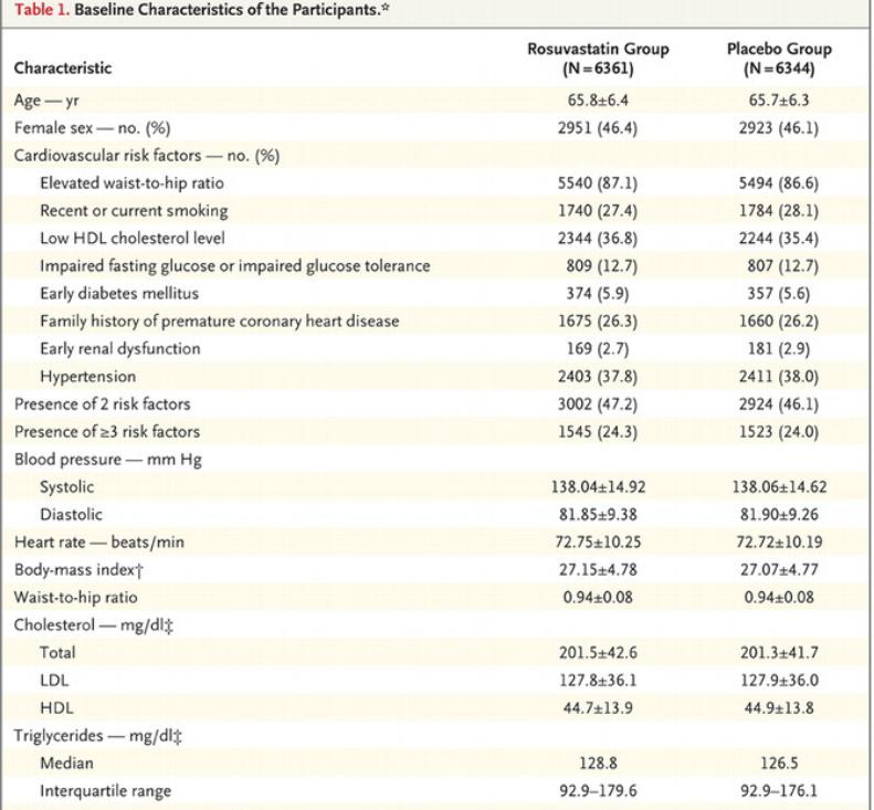 , se analiza el efecto hipolipemiante. Los participantes fueron asignados al azar a rosuvastatina 10 mg/día o a placebo. El resultado primario se produjo en el 3,7% del grupo tratado frente a 4,8% en el grupo placebo (HR= 0.76 IC95% (0.64-0.91). La reducción absoluta del riesgo fue del 1%, que se traduce (NNT) en que es necesario tratar a 91 pacientes durante 5-6 años para prevenir un evento. Como referencia, para que los médicos consideren una intervención beneficiosa, es un NNT de alrededor de 50 y, en torno a 30 si se les pregunta a los pacientes en un cuestionario. Para la variable secundaria, los resultados fueron muy similares. La diferencia era pequeña, pero con tantos pacientes los resultados fueron estadísticamente significativos.