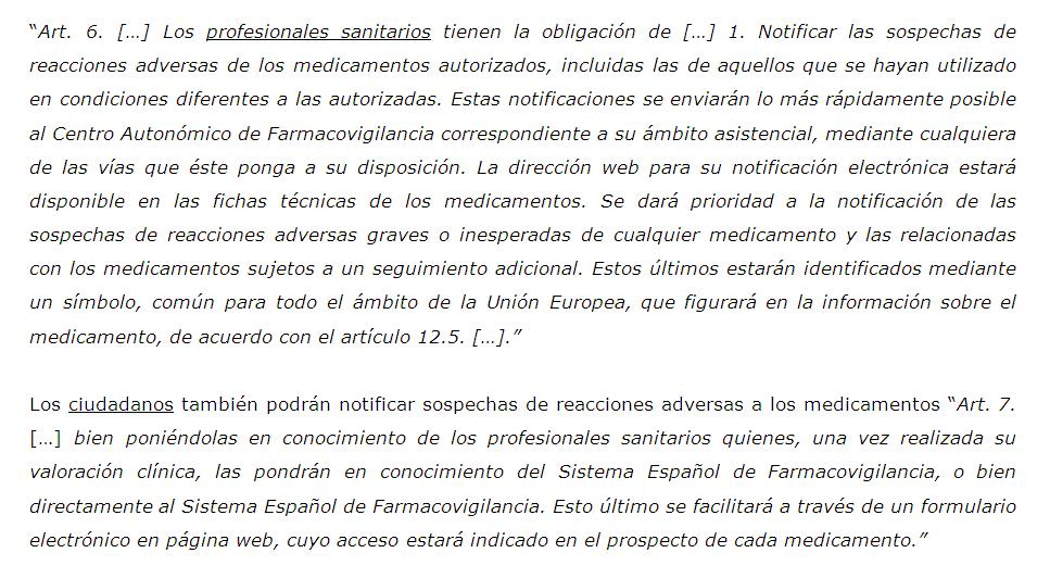 - los profesionales sanitarios (médicos, farmacéuticos, enfermeros, odontólogos y demás profesionales sanitarios) están obligados a notificar las sospechas de reacciones adversas a medicamentos