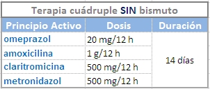 En la terapia SIN bismuto lo recomendado son 14 días. Se ha observado que a mayor duración de tratamiento, mayor eficacia (Gisbert, 2011