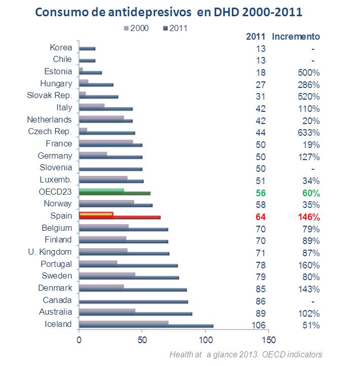 a por parte del paciente lo que ha derivado en la utilización de los antidepresivos como "válvula de escape" para combatir situaciones naturales de la vida (duelo, tristeza) que antes se afrontaban de manera diferente. Esta tendencia en el uso de los antidepresivos es una práctica denunciada con frecuencia tanto en los foros profesionales como en la prensa común. El consumo de antidepresivos está directamente relacionado con el estado de bienestar y, tal y como se refleja en el último informe de la OCDE